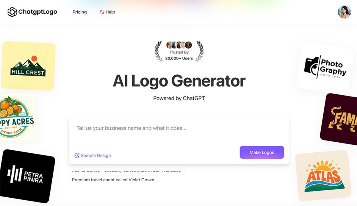 Create a custom logo in seconds using our ChatGPT-powered AI. Simply describe your brand in one sentence and pick the ideas you love — no design skills needed.